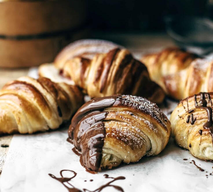 Half and half CroissantThese croissants are chocolate and vanilla marbled croissants, dipped in chocolate.